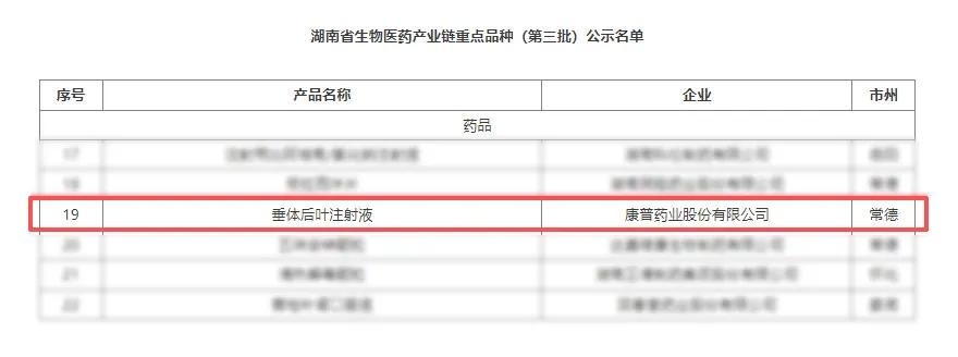 近日,湖南省工業(yè)和信息化廳公示了湖南省生物醫(yī)藥產(chǎn)業(yè)鏈重點(diǎn)品種(第三批)名單,康普藥業(yè)股份有限公司生產(chǎn)的垂體后葉注射液成功入選,成為湖南省生物醫(yī)藥產(chǎn)業(yè)鏈新增重點(diǎn)培育的23個(gè)藥品之一。